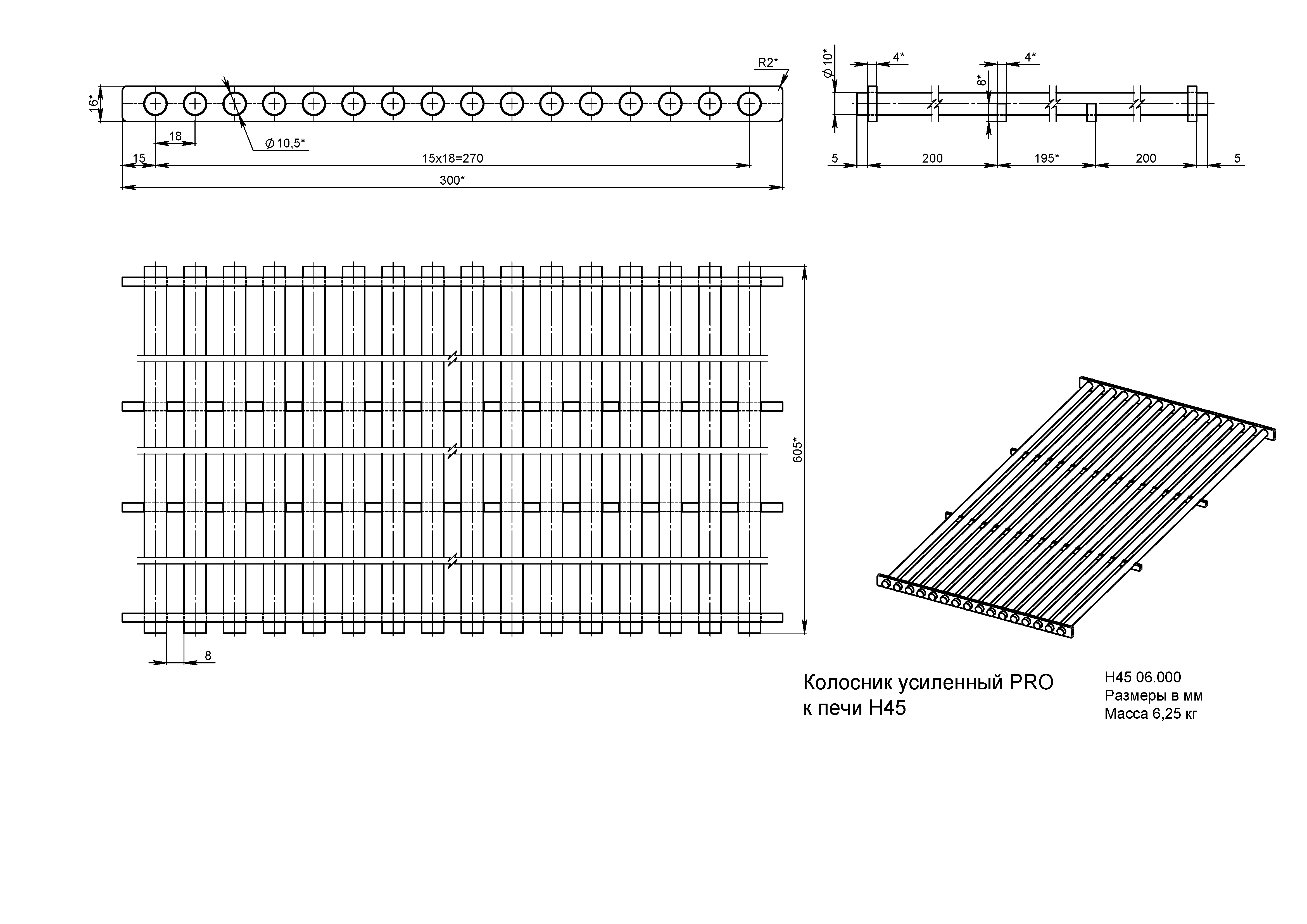 Колосник серии PRO производится из холоднокатанного прутка диаметром 10 мм (16 прутков, скрепленных 4 пластинами из нержавеющей пищевой стали толщиной 3 мм) и отлично подходит для коммерческой эксплуатации печи, где предполагается ее частое использование.