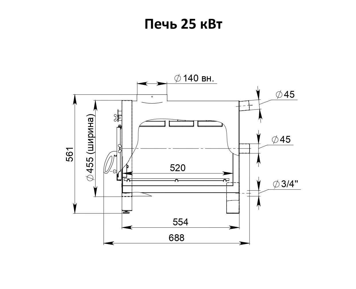 Наружная горизонтальная печь для купели мощностью 25 кВт подойдет для купели любой формы и размеров, для купелей, изготовленных из любых материалов: дерева, полипропилена, стеклопластика, металла.